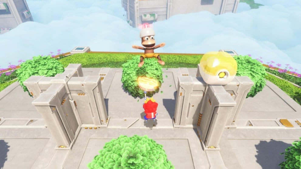 Working clockwise in this circular area, you’ll spot an ape looking into a nearby water fountain. It’ll spot you even if you sneak up on it, so cut the corner of the fountain to grab it.