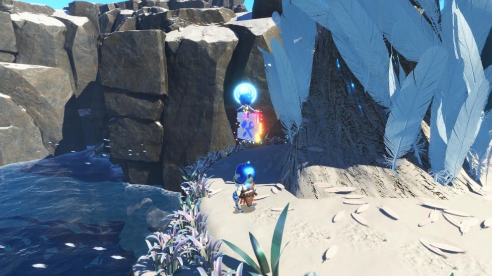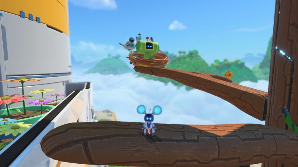 Head back up the cliff to where you first saw the bridge, but walk to the left instead. Slam down on the pressure pad to sprout three flowers you can climb up. There’s a clam-shaped enemy with a bot in its mouth, but it closes as you get near. Use the gloves to hold both sides and fling it open, saving the bot within.