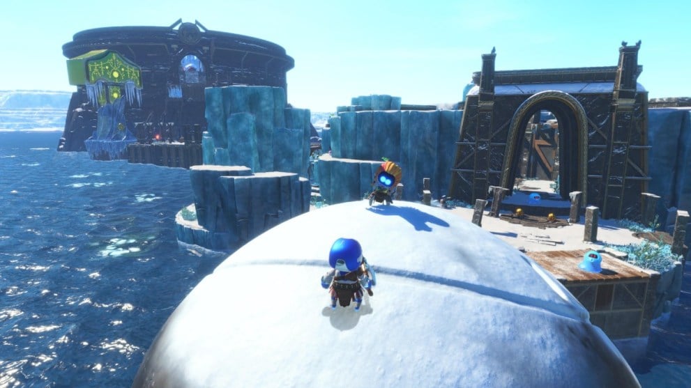 Next, go beyond that bridge and climb up the banana handrails that appear. Instead of going forwards, turn south and you’ll spot a cannon with a pressure plate surrounded by enemies. Slamming it spawns a wire to walk across to an island with a shipwreck on it. Make your way to the top and slam on the pressure plate to free a bot stuck in a tree.