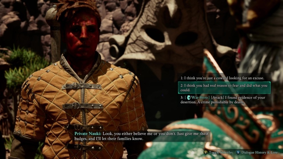 However, when confronting him, you need to select the “I met your friend Sergeant Hasui in the cave…” dialogue option and start questioning Nauki before forgiving him. If you select “I found your squad’s badges. Reward, please.” the quest will wrap up with you only getting the XP and not the coins.