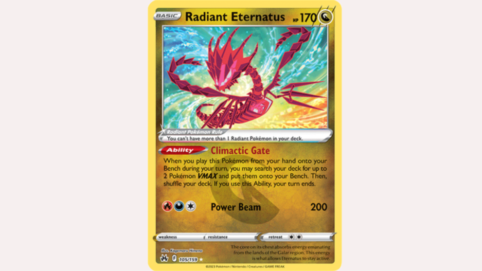 Radiant Eternatus has the potential to shake up the Pokemon TCG Standard format because it can skip the evolution from Pokemon V to VMAX, and it could be one of the more expensive cards in the set. Additionally, this card’s art features shiny Eternatus, which stands out from other cards in Crown Zenith: this is an all round great card to pull.