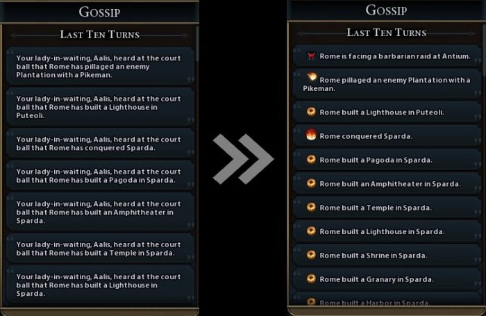 Gossip is one of the best ways to gain some interesting intel on the other civilizations, but it’s a bit underwhelming and underutilized in the game. To make the most out of the feature, you can download this mod that basically simplifies the gossip history log and removes any fluff and unnecessary messages. Each message also has its own category, making it easier to track a certain civilization at a glance.