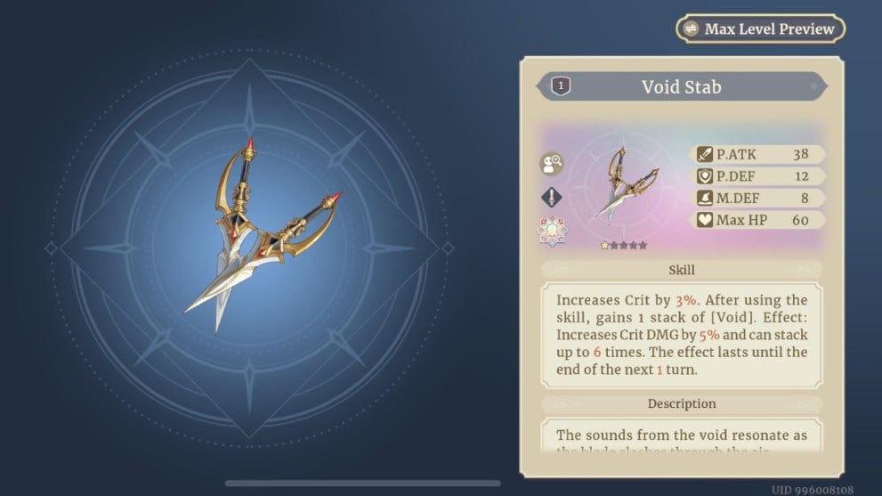 For the final gear slot, be sure to equip the Void Stab. These come alongside Col’s banner, increasing HP and P. Atk slightly. However, their best feature is a base 3% increase on Crit attacks, further increasing by 5% up to six times.