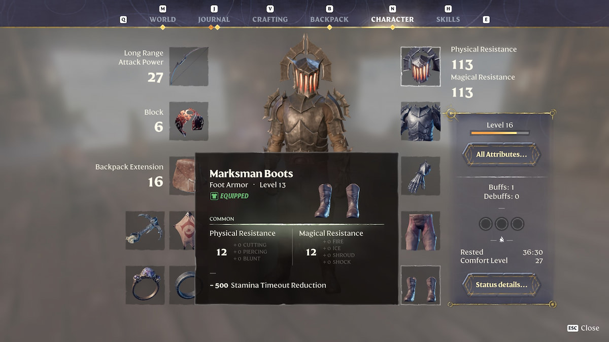 Firstly, you can craft Deerstalker Trousers, Deadeye Boots, and the Archmage Hat once you reach the Kindlewastes. Until then, use Mage/Magician headgear and gloves and the best Stamina Timeout Reduction boots you can craft. It’s extremely useful for exploration, and all the other boots are just irrelevant.