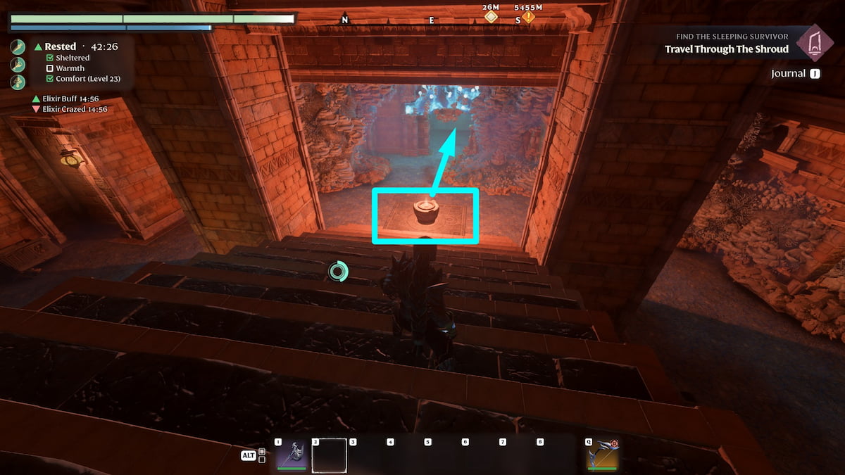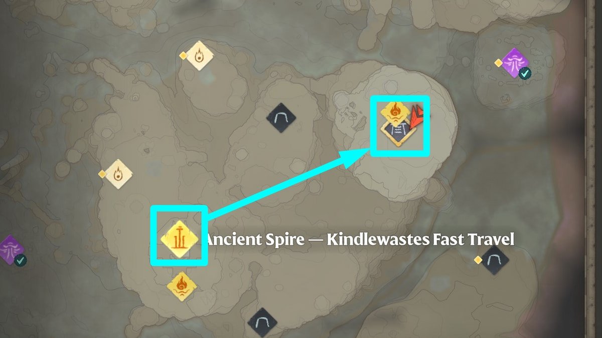 First, go to the Sun Temple east of the Kindlewastes spire shown on the map below. Progress the first couple of rooms until you reach a staircase leading down.