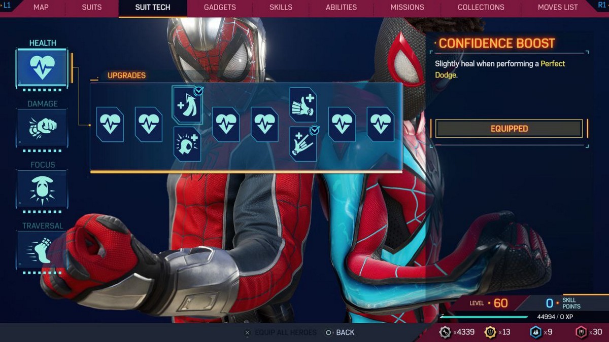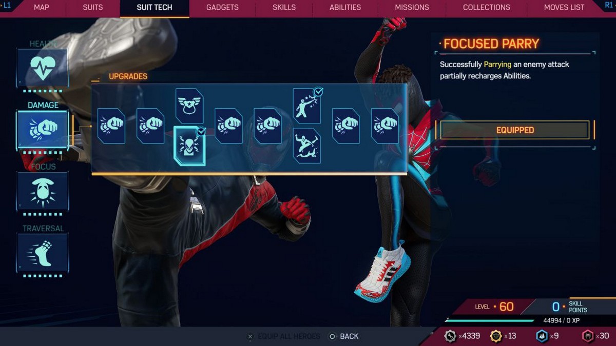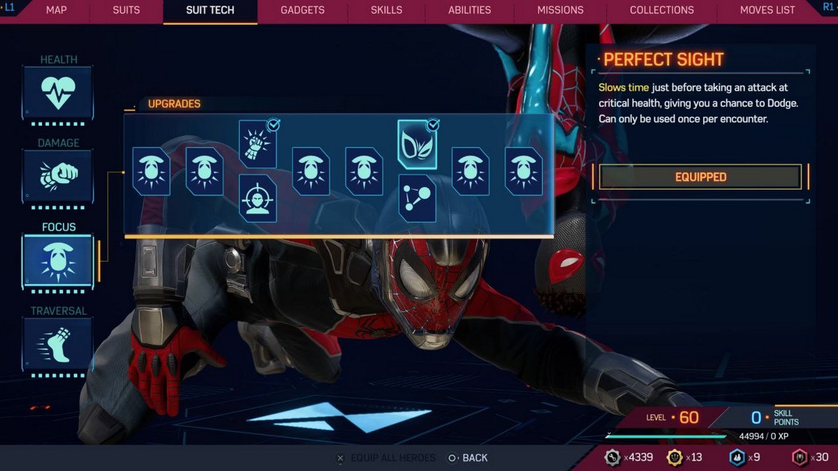 Suit Tech, or basically suit upgrades, will help Peter and Miles by enhancing four main areas that are crucial in Marvel’s Spider-Man 2. Health, Damage, Focus, and Traversal can all be improved one way or another to increase the effectiveness of players, and it is imperative that you don’t ignore this portion of the game while swinging through New York and beating up evildoers.