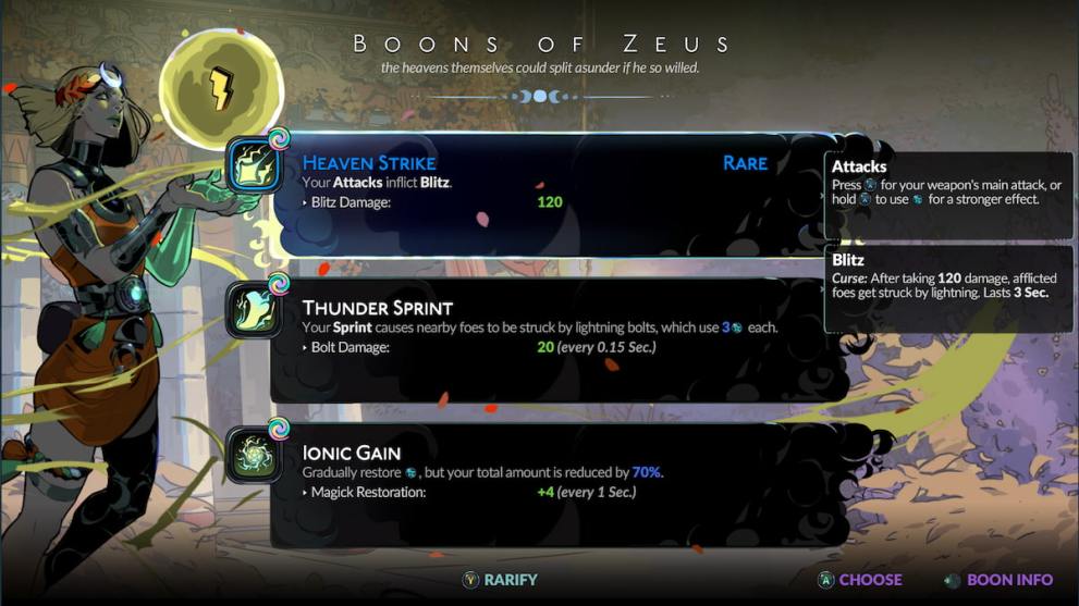 When it comes to Zeus, his boons are less about giving you direct damage, and more about augmenting the damage you’re already doing with a powerful curse called Blitz. This curse activates when you do 120 damage to an enemy, and then that said enemy is struck by lightning that does anywhere from 80 to 200+ damage depending on the rarity and level of the right boon.