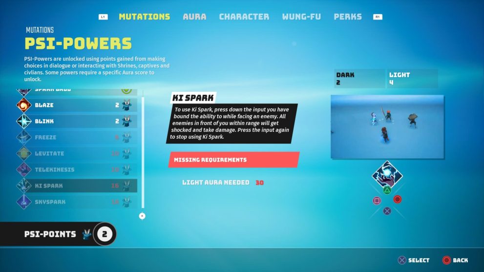 You’ll now find a list of all Psi-Powers you can unlock and their requirements. Each Psi-Power will require some Psi-Points to unlock in Biomutant, but some will also have an Aura requirement in order to unlock. This means you’ll need to either earn Light or Dark points and reach a set amount in order to unlock them.