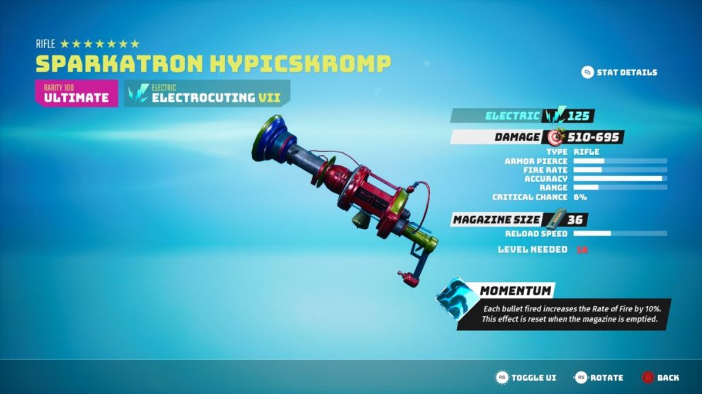 This contains the Sparkatron Hypicskromp, a Rarity 100 ‘Ultimate’, Electric ranged rifle. It deals 125 electric damage, and 510-695 standard damage without being upgraded.