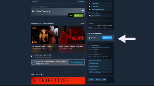 Well, it turns out that you can in fact play Lethal Company on the Steam Deck, though with a small caveat. The game is very much playable on the handheld console, however it has not yet been fully optimized for it. If you go to the game’s store page on Steam and scroll down, on the right side you’ll see a new sub-menu called ‘Steam Deck Compatibility‘. This indicates the game’s technical progress with the specs of the Steam Deck, and Lethal Company is currently listed as “Playable” on the status tier.