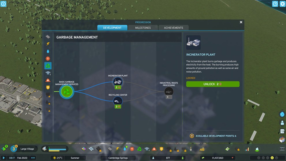 Be sure to also keep a check on your city’s ground, air, and noise pollution menus, found on the bottom row of the “i” menu, as all of these attributes are negatively affected by your garbage processing facilities.