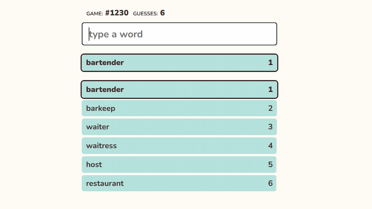 The word BARTENDER is the Contexto answer for January 30, 2026. This makes it the Contexto answer number 1230.