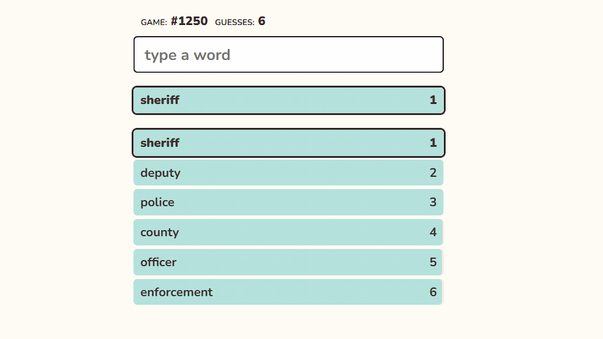 The word SHERIFF is the Contexto answer for February 19, 2026. This makes it the Contexto answer number 1250.