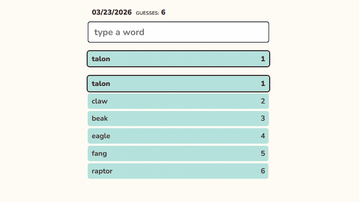 The word TALON is the Contexto answer for March 23, 2026. This makes it the Contexto answer number 1282.