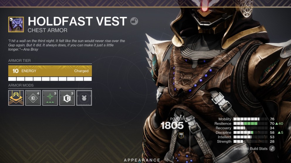 - Priority Stats: While Resilience is important as always for a PvE build, we’d also recommend investing in Discipline to further improve grenade ability regen times.