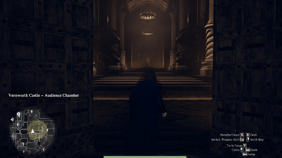 Head inside and go towards the right into the large open area. You’ll see a massive door on the left. Open this and head inside the Audience Chamber.