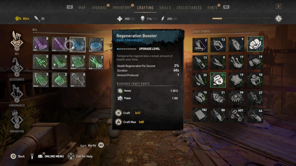 - Utilize Poppy and other materials like Honey, Chamomile, and more to help craft useful items such as a Regeneration Booster.