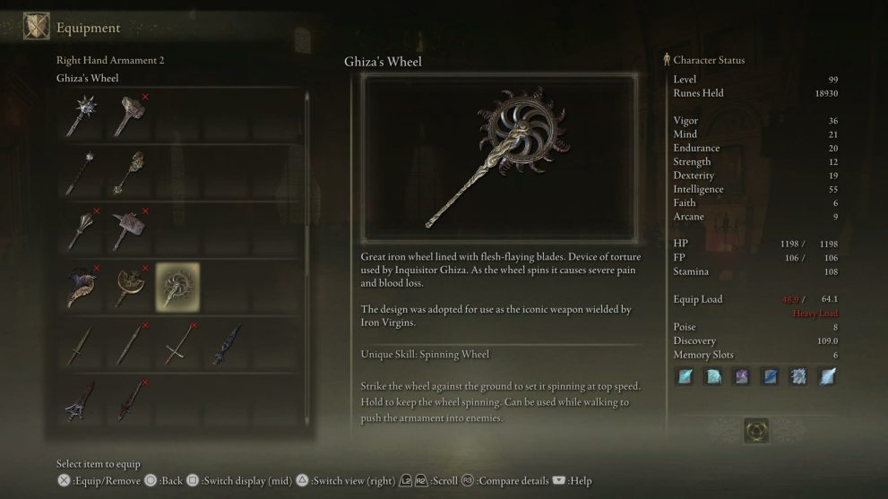 A clear throwback to the Whirligig Saw from Bloodborne, Ghiza’s Wheel is a strength-based weapon with stat requirements of 28 Str and 18 Dex.