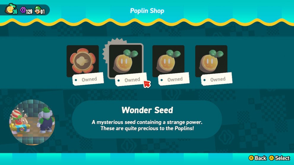 This Poplin Shop sells your basic items and one Wonder Seed, plus the new Coin Magnet Badge.