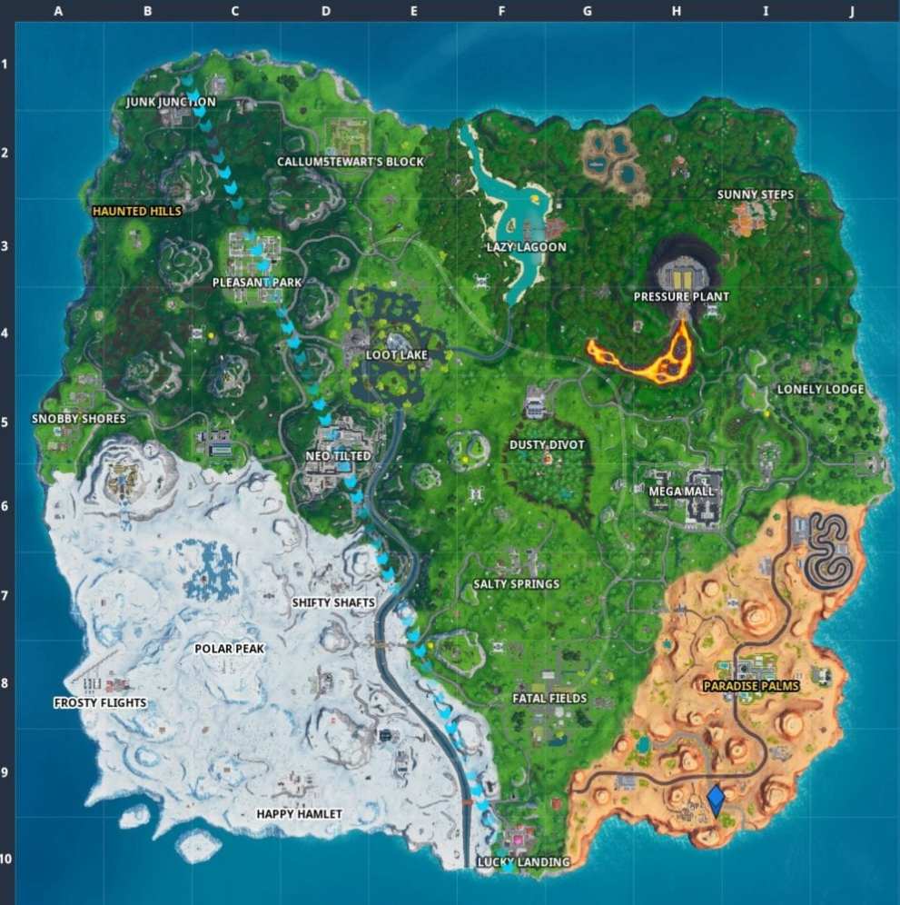 The huge rubber ducky that you need to visit alongside a giant beach umbrella in a single match is a bit of a tricky one. Where we previously thought that aforementioned duck with cool shades stayed in one location, it’ll actually travel up the river by Neo Tiled and sometimes roam into Loot Lake, too. It’s pretty enormous, though, so it’s not too difficult to spot as you’re gliding down.