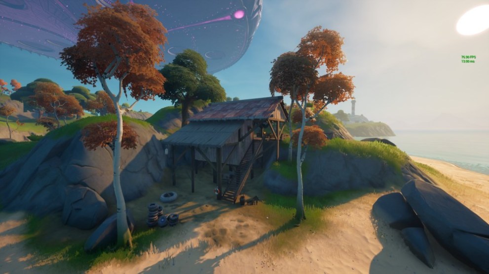 The Unremarkable Shack can be found at the very north of the map, on an island between Stealthy Stronghold and Craggy Cliffs. The shack is on the northwest section of the island. There’s a barrel full of fishing rods at the bottom of the shack’s tall stairs, near some tires. There are also fishing holes at this remote Fortnite POI.