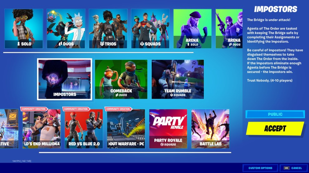 - Load up Fortnite and select the Impostors game mode from the lobby screen.