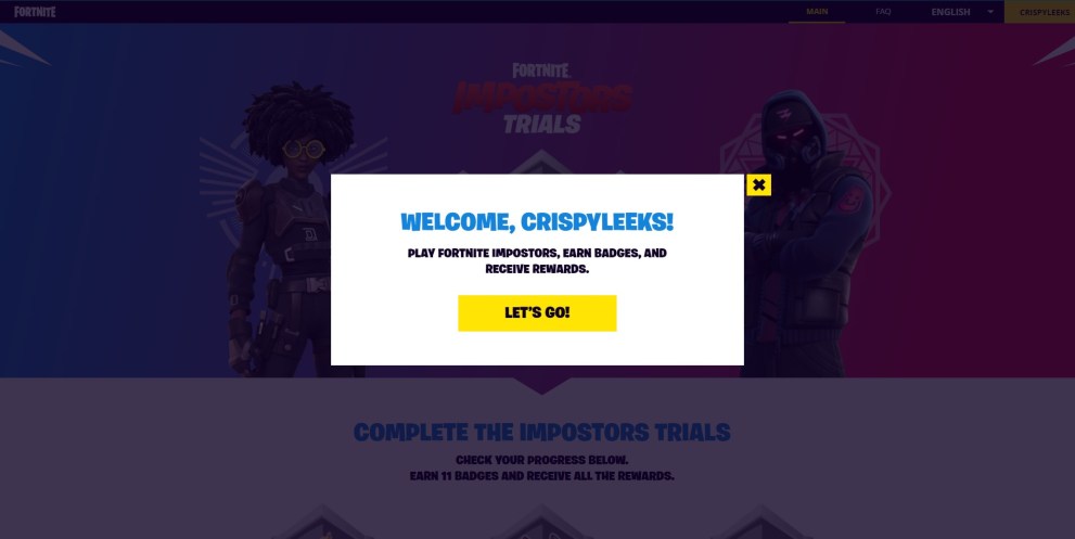 - You should now receive a message confirming you’re all logged in and are a part of the Fortnite Impostors Trials.