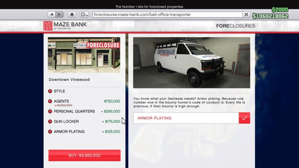 - Maze Bank Foreclosures: Head over to the Maze Bank Foreclosures website to browse the available Bail Offices. There are five locations spread across Southern San Andreas, each with a varying price tag.