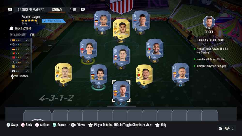 Due to the 85-rated team requirement, we recommend going bigger on a couple of players. Rúben Dias (88) and De Gea (87) will be big costs up front, but you’ll be able to save on the rest of your squad — a little bit, at least — with one 85, four 84s, and four 83s. Balanced as all things should be, right?