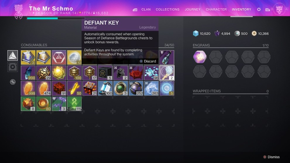 As mentioned above, Defiant Keys will grant you bonus rewards by opening a chest at the end of a Defiant Battleground run. This loot could be high-stat seasonal armor or potentially Deepsight versions of the new seasonal weapons that can be crafted, so it’s safe to say these keys are pretty important.