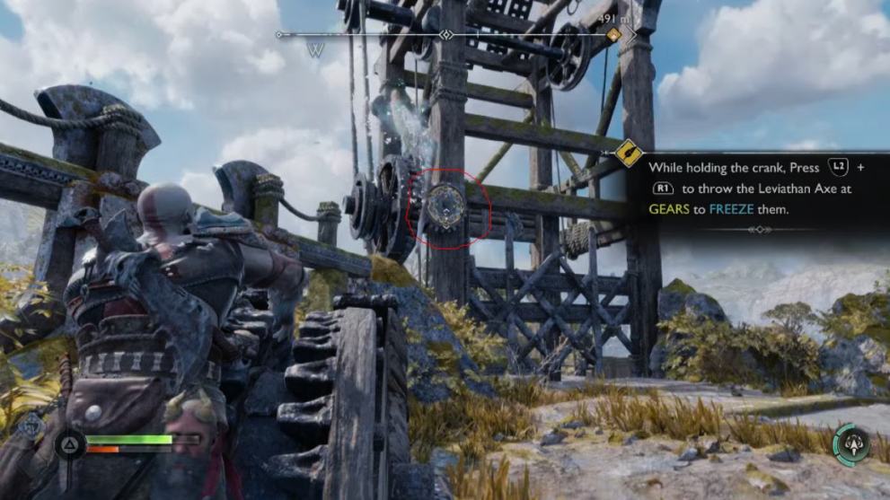3. Climb around the edge, go up and turn the gear to raise the platform, and throw the axe to freeze its location in place.