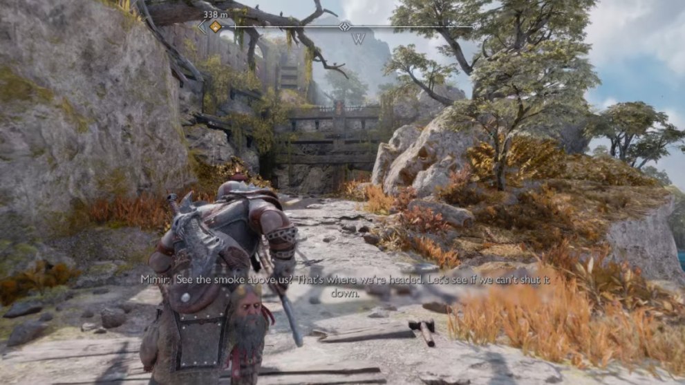The first or closest one is located on an inlet just to the right of where you came in. When you get on the shore, there’s a path that leads uphill, slightly to the left of the mystic gateway. If you climb up here, you’ll come upon a locked door, prompting Mimir to comment that he wants you to get the key that’ll unlock it so that he can set right an old wrong.