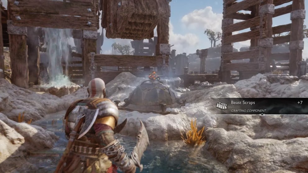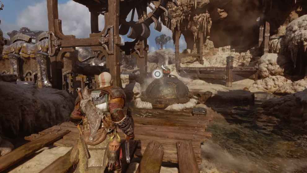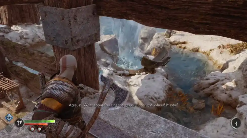 With this geyser now uncovered, return to the one underneath the wooden structure, and freeze it with your Leviathan Axe again. This will cause the geyser you just uncovered to increase in pressure, turning the water wheel above and causing a weight to drop down above the first geyser under the structure.