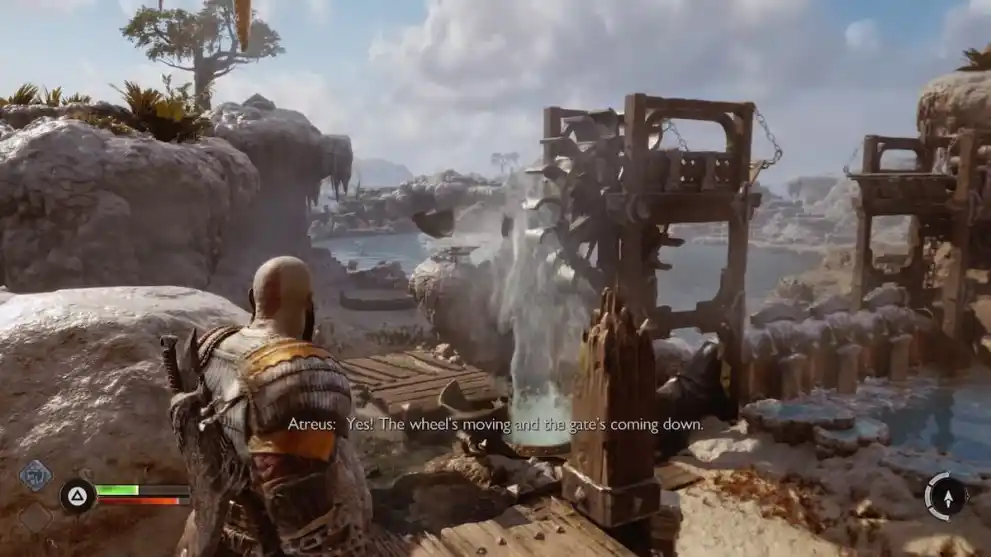 After passing underneath a bridge, you’ll encounter a large gate blocking Kratos and Atreus’ way. To get it open, you’ll need to solve some environmental puzzles involving the water wheels and geysers around you.