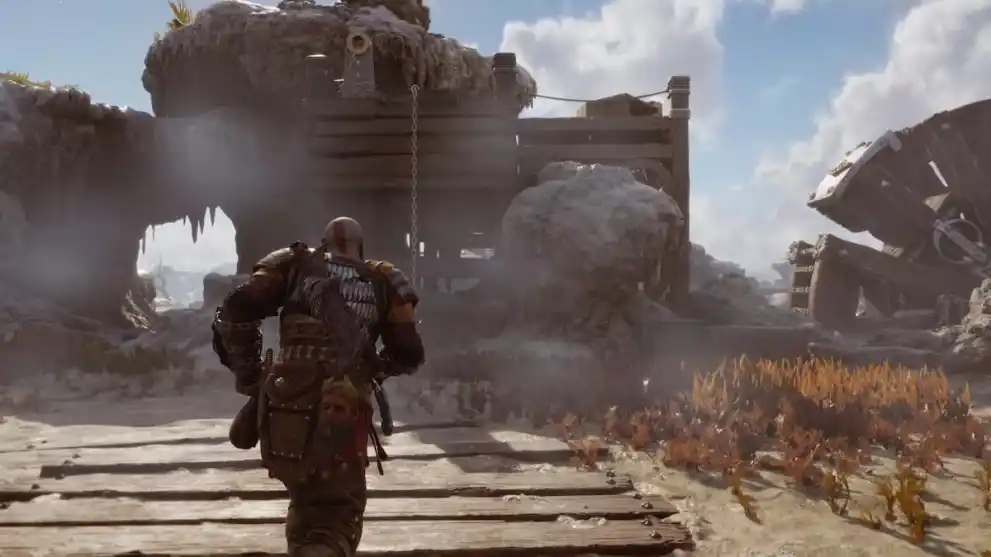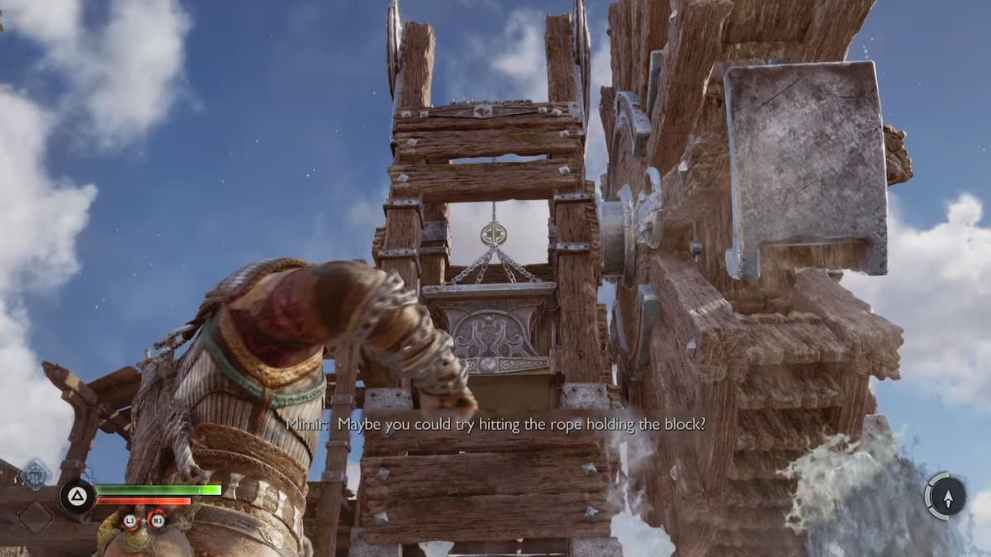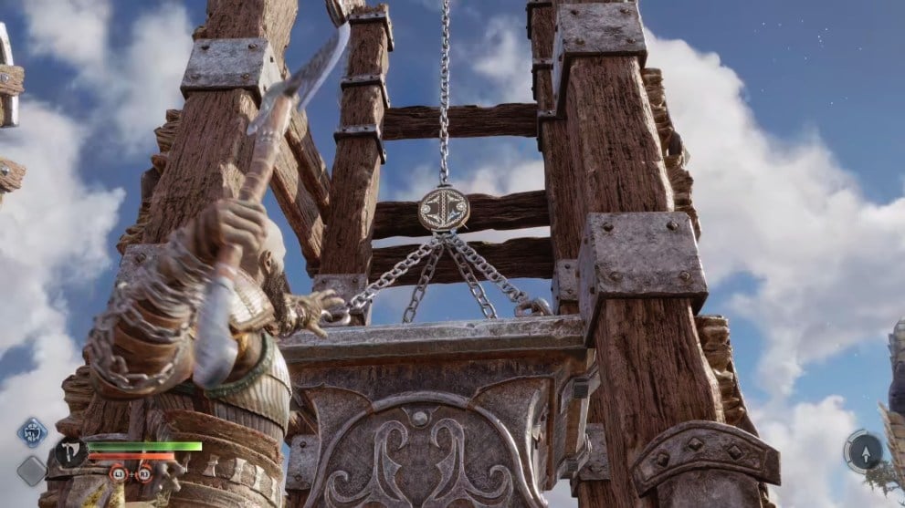 When you’re on land, head into the main area right in front of you, and then take a hard right and you’ll find a large metal weight hanging in the air. Use your Leviathan Axe to break the chain above it and cause it crashing down so you can climb on top.