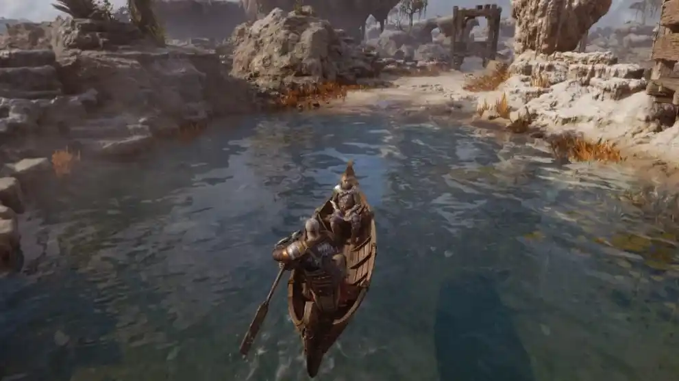 When you come across the large water wheel, you want to park your boat up to the right of it (as you’re facing the wheel), and then proceed down this right-hand side, defeating the creature enemies that’ll ambush you on land here.