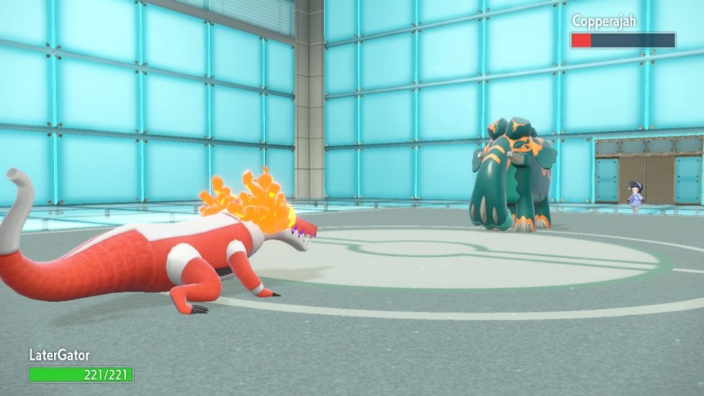 Poppy starts the battle with her level 58 Copperajah. Copperajah is a pure Steel Type Pokemon, meaning it’s very weak against Fire, Fighting, and Ground Type moves. Steel Types naturally weigh more on the defensive side, and Copperajah is no exception. However, a few moves of the super effective types listed above should get the job done with little issue.