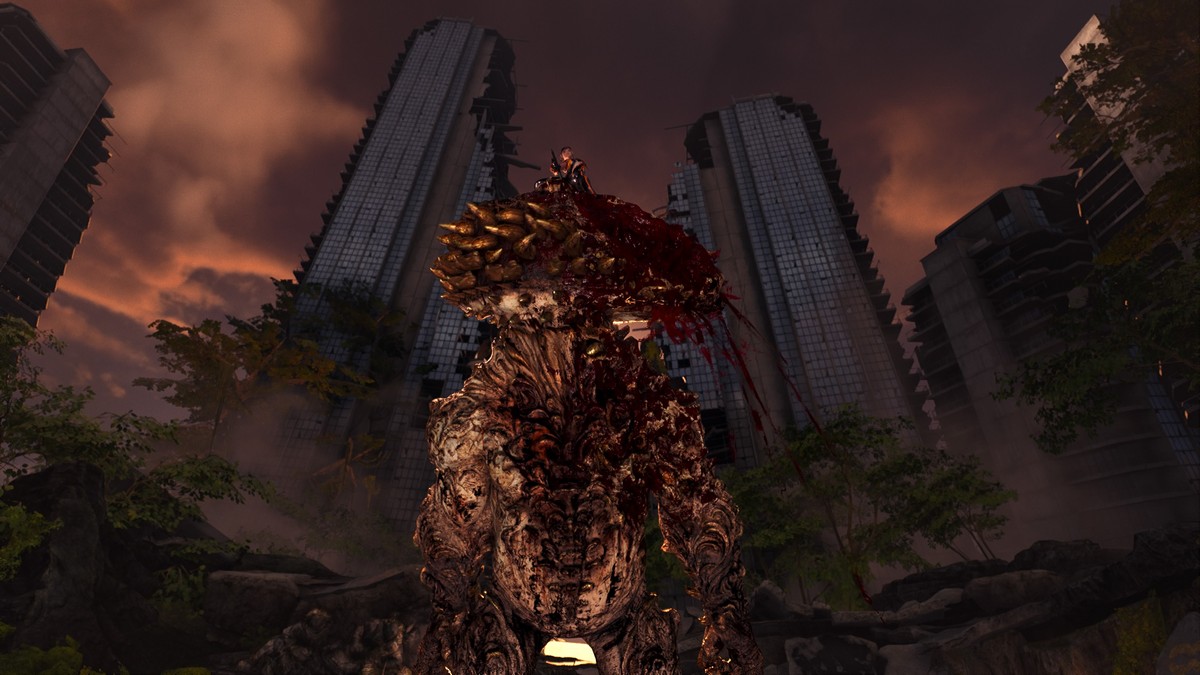 If Eve is further away, the Gigas is fond of using its spiky head to grind against the heroine, followed by a blue Fatal Attack. Dodge towards it when the blade glows blue to counter, stunning it and opening a window for more pain. It can also throw pieces of the environment as a ranged attack, but it hardly connects if players are on the move. The Gigas may also use the unblockable leap and slam using its body, so either time the dodge properly or keep sprinting to avoid the attack completely.