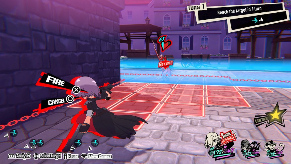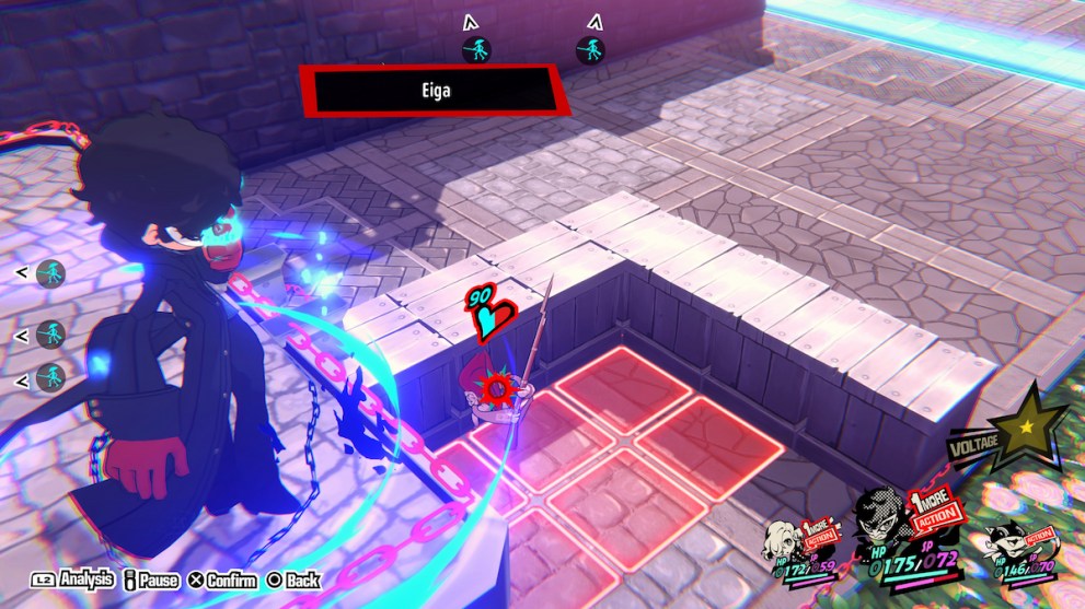 After the two gunners get sent flying below, move Joker to the end of the platform and you’ll see a gunner in cover below. The only way to break this enemy’s cover is using the party member on the right side (Joker). Using Joker’s Eiga ability on the gunner below removes their cover but doesn’t Down them. Erina will now have the opportunity to Down this enemy for a One-More.