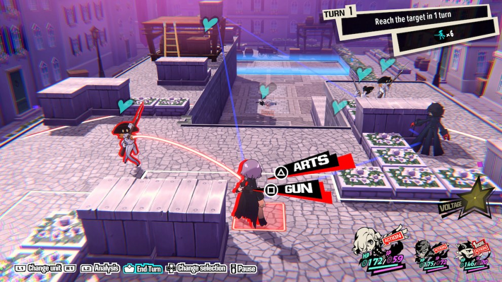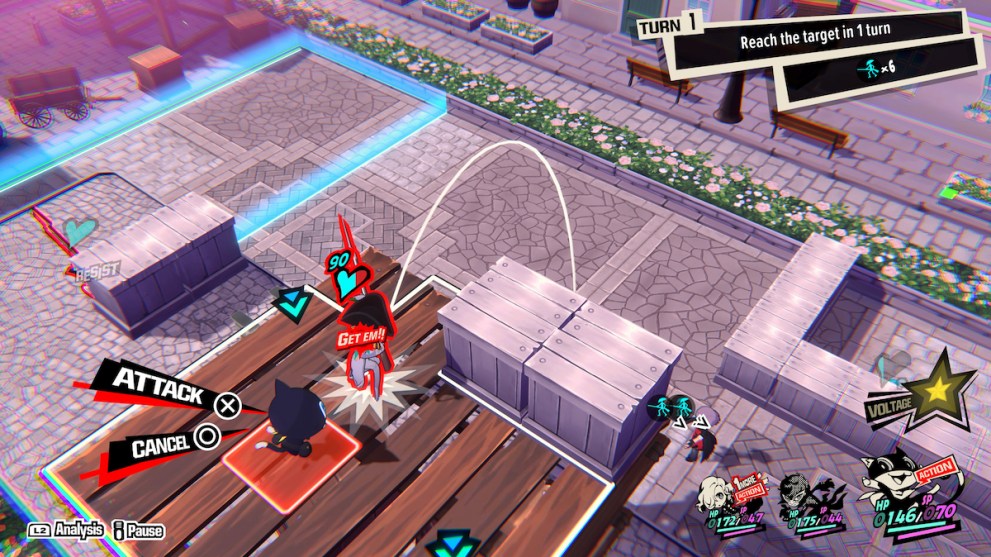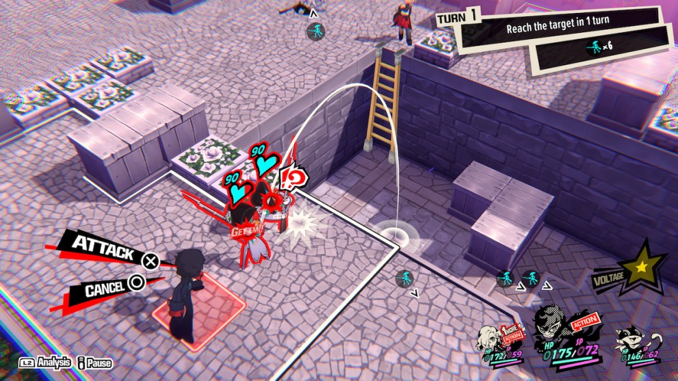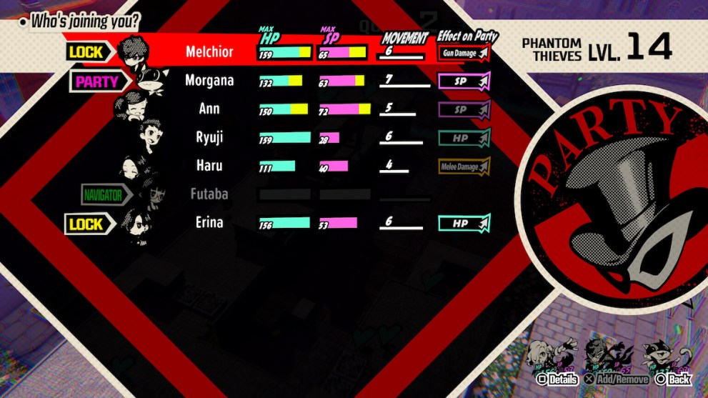 Certain party members are typically mandatory (locked) depending on the Quest. For Persona 5 Tactica’s second Quest, Joker and Erina are locked into your party, leaving the player with four choices for the third member: Morgana, Ann, Ryuji, and Haru. Morgana is highly recommended for this Quest because of his Sweep ability that pushes enemies off platforms. It is possible to complete this Quest without Sweep, but it requires a higher movement range for the character and certain Sub-Persona AOE abilities to accomplish. For simplicity’s sake, we chose Morgana for this walkthrough.