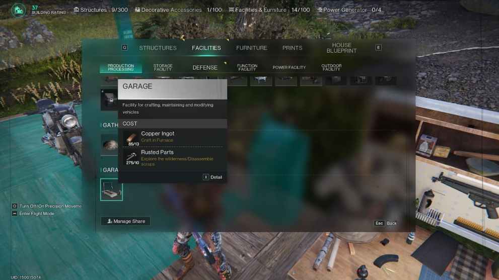 After unlocking the skill, when you are at your base, press the ‘B’ key to enter Building Mode and then the ‘RMB’ to open the Building Menu. Once done, head to the Facilities tab and under Production Processing, scroll down until you find the Garage that you can build using Copper Ingot x13 and Rusted Parts x10.