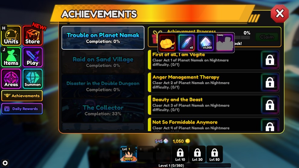 Other rewards for these achievements include Trait Rerolls for each Act, another set of five Trait Rerolls, 1,000 Gems, and the “Casey” emote. As soon as you’ve cleared all six missions, select “Claim”, and the rewards including the mount will be yours.
