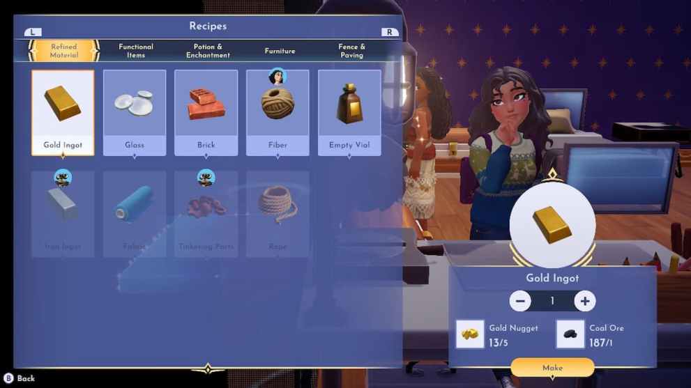 You can make Gold Ingots at any Crafting Station throughout Disney Dreamlight Valley by using Gold Nuggets and Coal Ore (you can get these materials from black rocks.) Compared to Iron Ingots, these resources sell at a higher rate with a price of 130 Star Coins.
