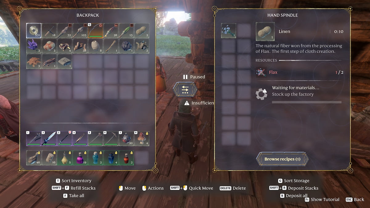 Once you’re done with that, place the Hand Spindle in your base and fill it with Flax. The recipe that’s selected by default is Linen, and production will commence immediately. Each piece of Linen needs two Flax to make and 10 seconds of production time, making it one of the quickest resources to make in Enshrouded.