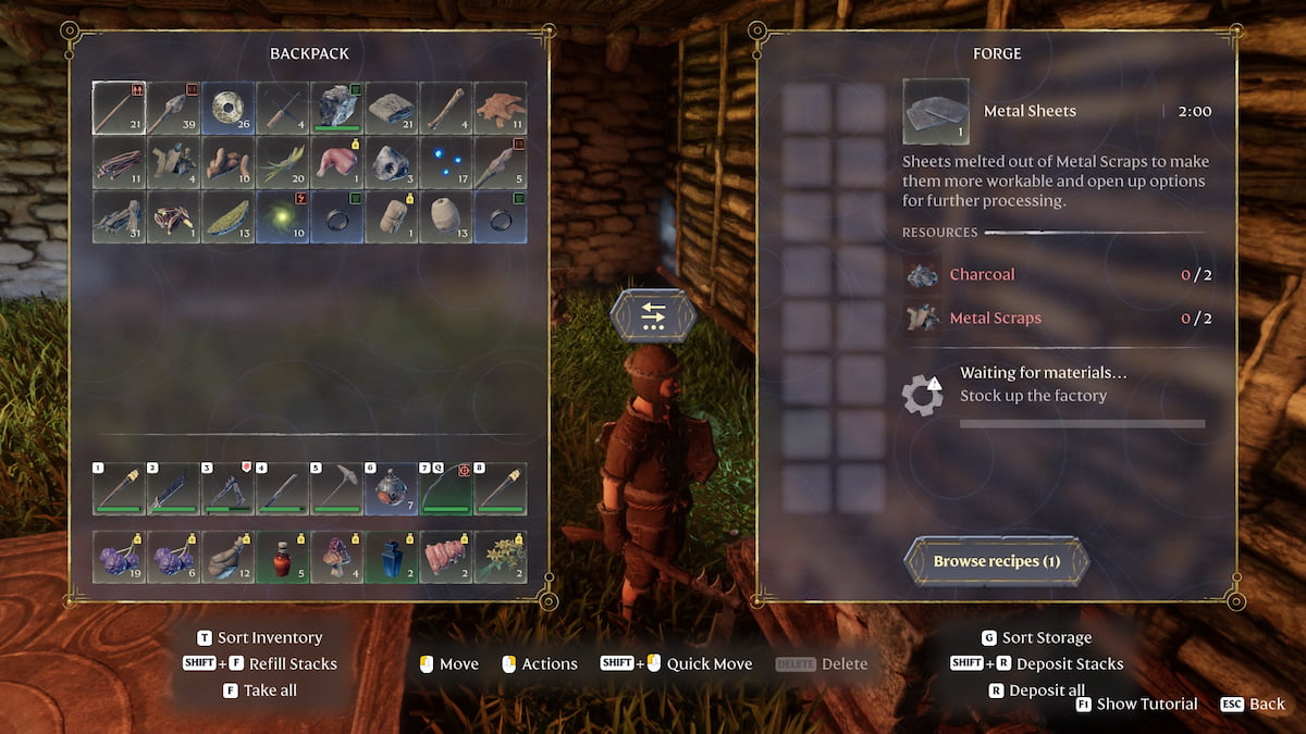 If you want to craft Metal Sheets in Enshrouded, you will first have to get Charcoal and Metal Scraps. To even get access to the recipes, you will first need to find the Blacksmith Survivor and summon them to your base. He will then expand your crafting options to the Kiln, the Forge, and, in turn, to Metal Sheets.