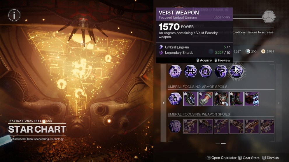 The other way you can obtain the Lunulata-4b is through focusing Umbral Engrams at the Helm. Umbral Engrams, much like world drops, can drop at any point while playing the game, as well as a reward at the end of an activity. You can take them to the Helm and use them to buy engrams with specific loot pools, meaning if you want to get the Lunulata-4b you’ll want to use your umbrals on the Veist Weapon focusing option. The Veist Weapon engrams can drop one of five weapons, meaning that every one you purchase will get you a 20% chance of getting the bow. This is the fastest way to obtain the god rolls you may be looking for, as long as you don’t need to use those umbral engrams elsewhere.