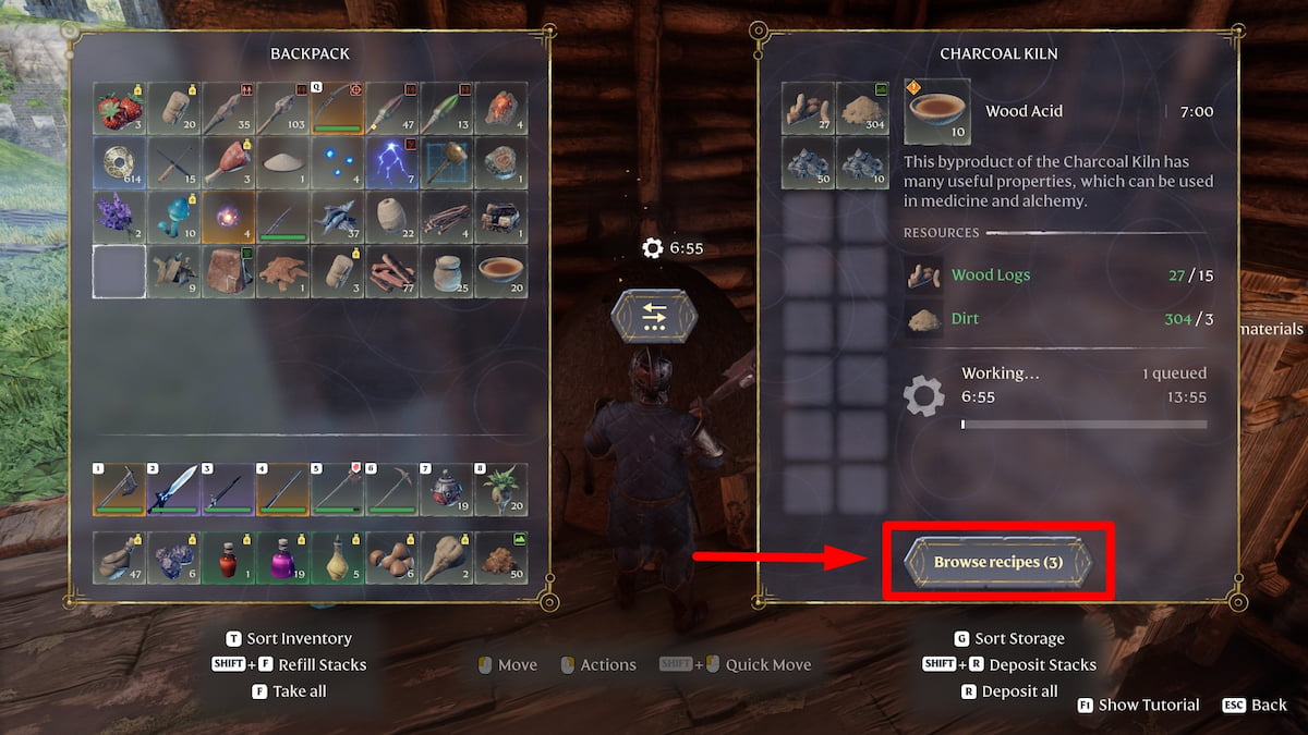 Now, you’ll need Wood Logs and Dirt. Specifically, 15 Wood Logs and 3 Dirt for each 10-stack of Wood Acid you want to produce. Deposit them into the Charcoal Kiln and select the recipe from the menu (Browse recipes button on the bottom).