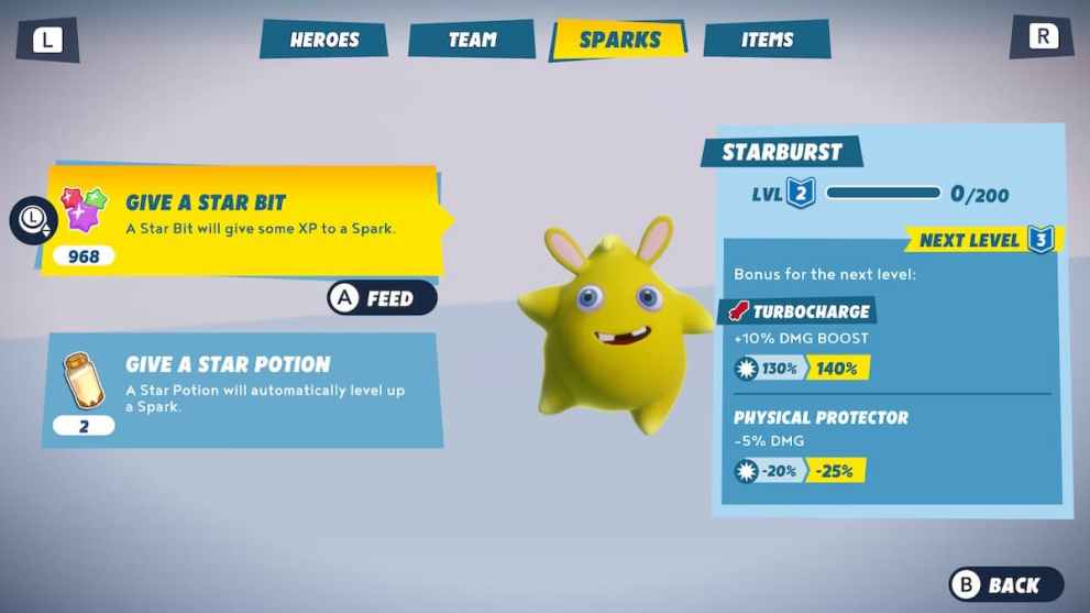 Star Potions can be especially limited so a good tip to keep in mind is to use Star Potions for the more expensive levels. Level 2 only costs 100 Star Bits and Level 3 only costs 200 Star Bits. Feel free to spend on those, but you’re looking at 350 Star Bits after that to get your Sparks to Level 4. You are much better off saving Star Potions for those.