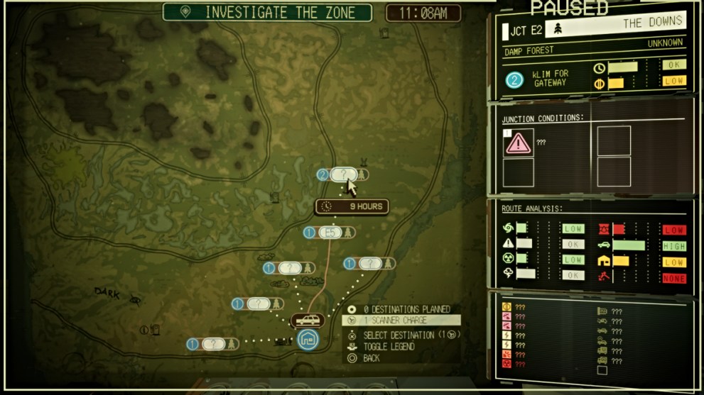 You’ll see where you and your car are currently at, along with the routes and how far away each one is by the number of hours. You can travel to any that you currently see, but before you set out you do need to be mindful of the conditions in each Junction, as some will be more dangerous than others. Know what you’re getting into before you head out, as you need to take care of not only yourself but your car as well.