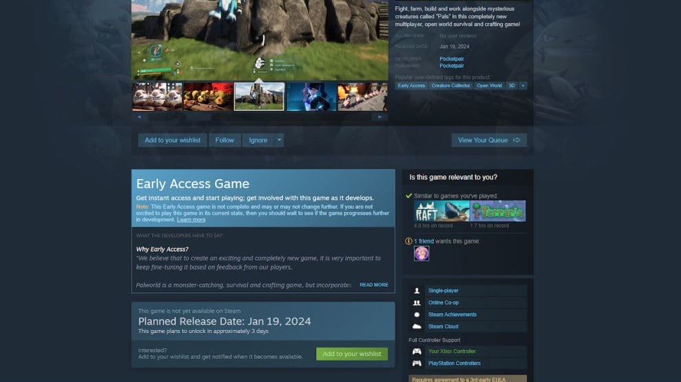If you’re looking forward to catching Pals of your own to start farming and/or fighting with, you’re in luck. To play Palworld in early access on Steam, all you have to do is go about getting the game the same as you would any other title on the game service.
